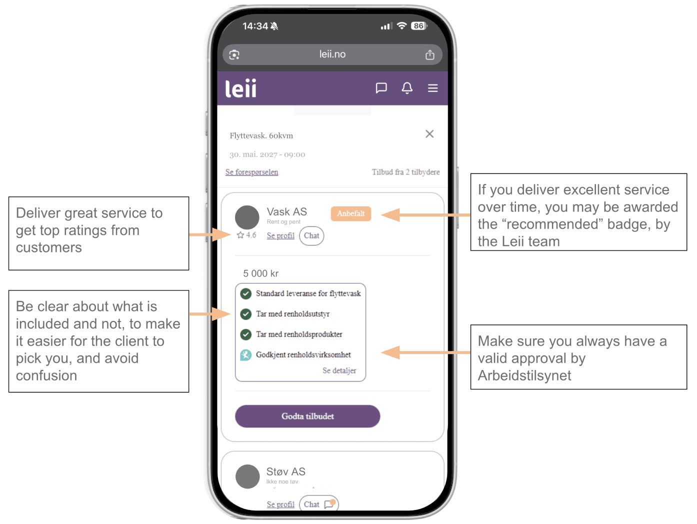 To get new clients through Leii, you need to be approved by Arbeidstilsynet as a registered cleaning company (you can apply here). Leii perform daily checks against the renholdsregister, to assure this is always valid when you are providing services through Leii.